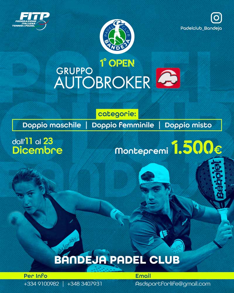 SPORT FOR LIFE – BANDEJA PADEL CLUB organizza il 1° Open “Auto Broker” – DM-DF-D Misto € 1499 dal 11/12/2023 al 23/12/2023 sui propri campi siti in Contrada Lecco, Rende (CS).